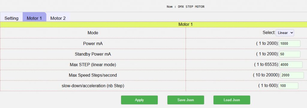 Max STEP (linear Mode) : Nombre de pas total à effectuer pour 100% de la valeur DMX (256 pas en 8 bits, 65535 en 16bits) peut etre équivalent a 10 tours complets comme 40…