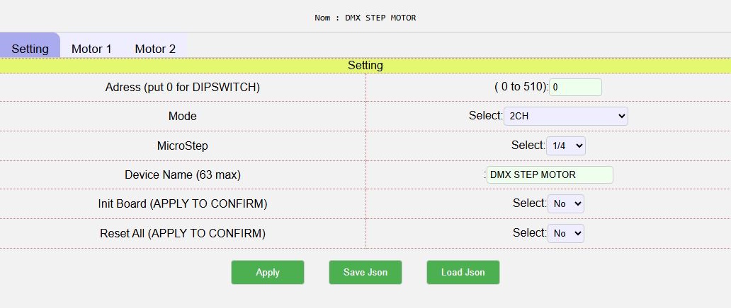 Avec votre console en fonction du mode de fonctionnement (Fixture) et de l’adresse assignée, vous pouvez maintenant contrôler la position et la rotation de vos moteurs connectés sur la Carte DMX pour 2 Moteurs pas à pas Bipolaire.