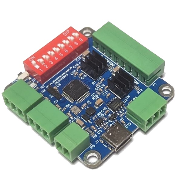 - Jusqu’à 2 Moteurs Bipolaires par carte jusqu’à 2 Ampères par moteur