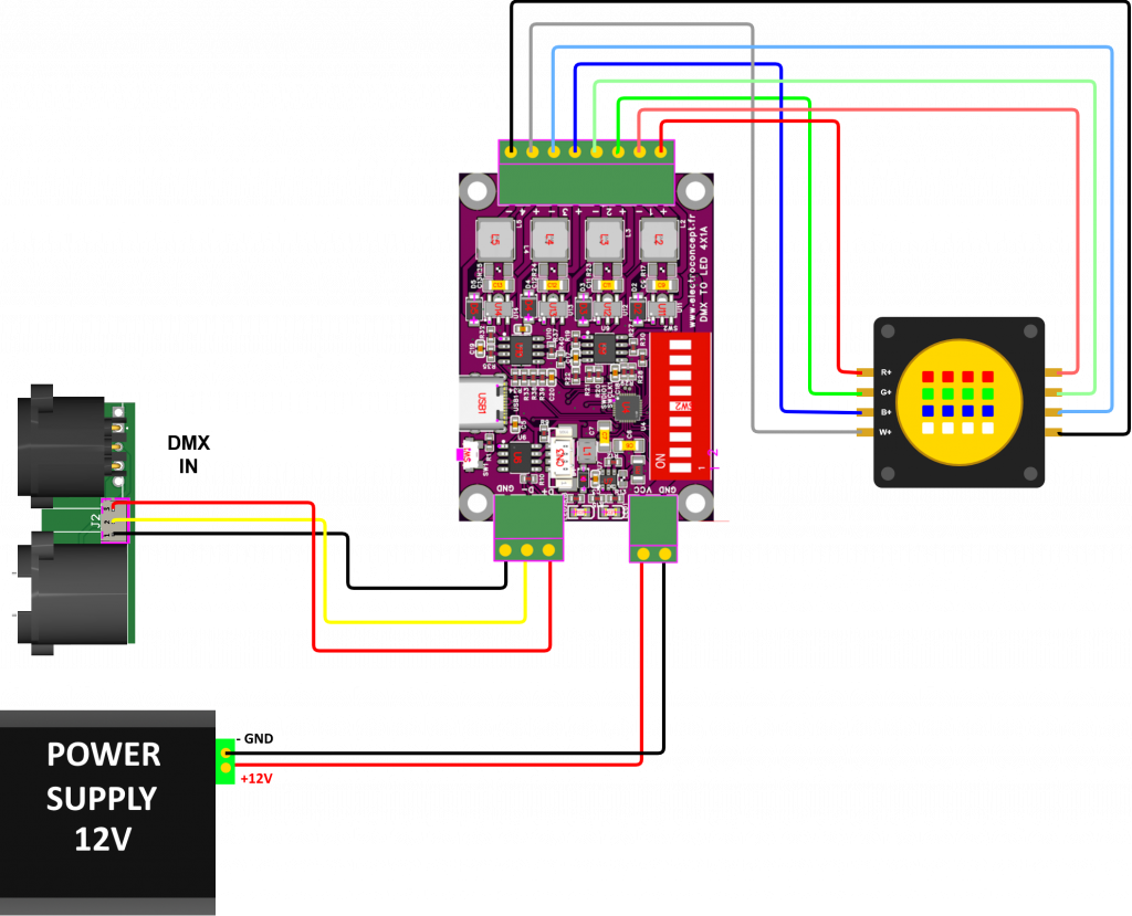 Avec votre console en fonction du mode de fonctionnement (Fixture) et de l’adresse assignée vous pouvez maintenant contrôler les niveaux de sorties de la carte Contrôleur DMX pour LEDs de puissance 4 canaux.