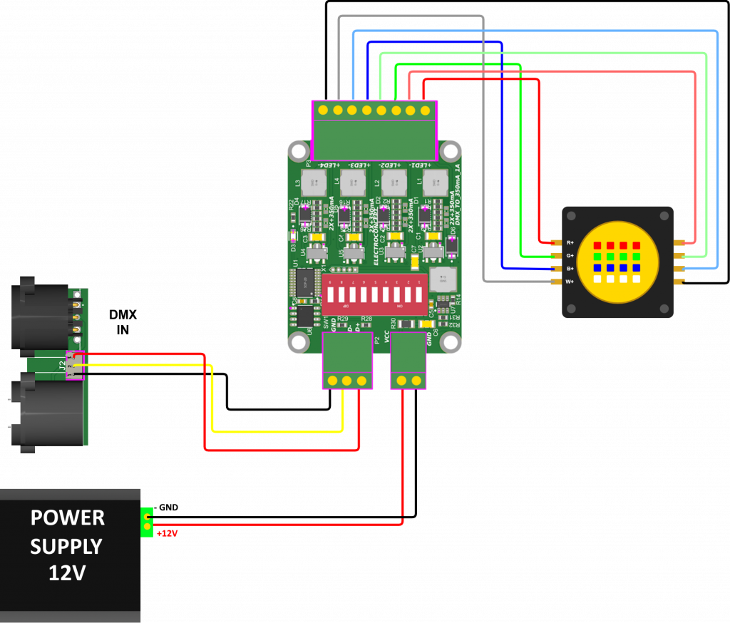 Avec votre console en fonction du mode de fonctionnement (Fixture) et de l’adresse assignée vous pouvez maintenant contrôler les niveaux de sorties de la carte Contrôleur DMX pour LEDs de puissance 4 canaux première génération.