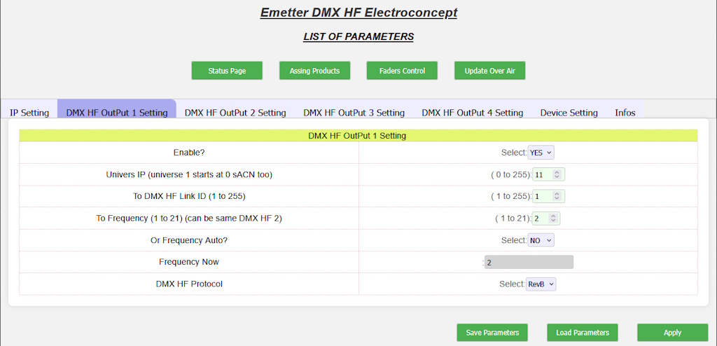 • Load Parameters : Charge une configuration stockée sur votre ordinateur dans la page de configuration web, une fois chargée, cliquer sur Apply.