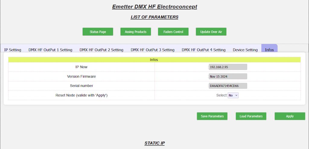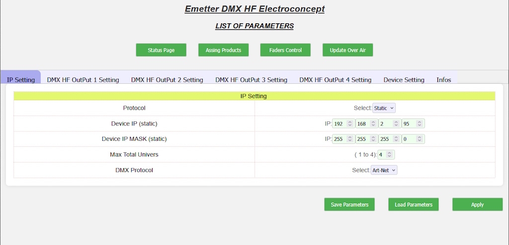 Par défaut l’ Emetteur DMX HF V3 Artnet/sCAN 4 Univers + POE est livré configuré en DHCP, avec 4 entrées en Art-Net et 4 sorties DMX HF.