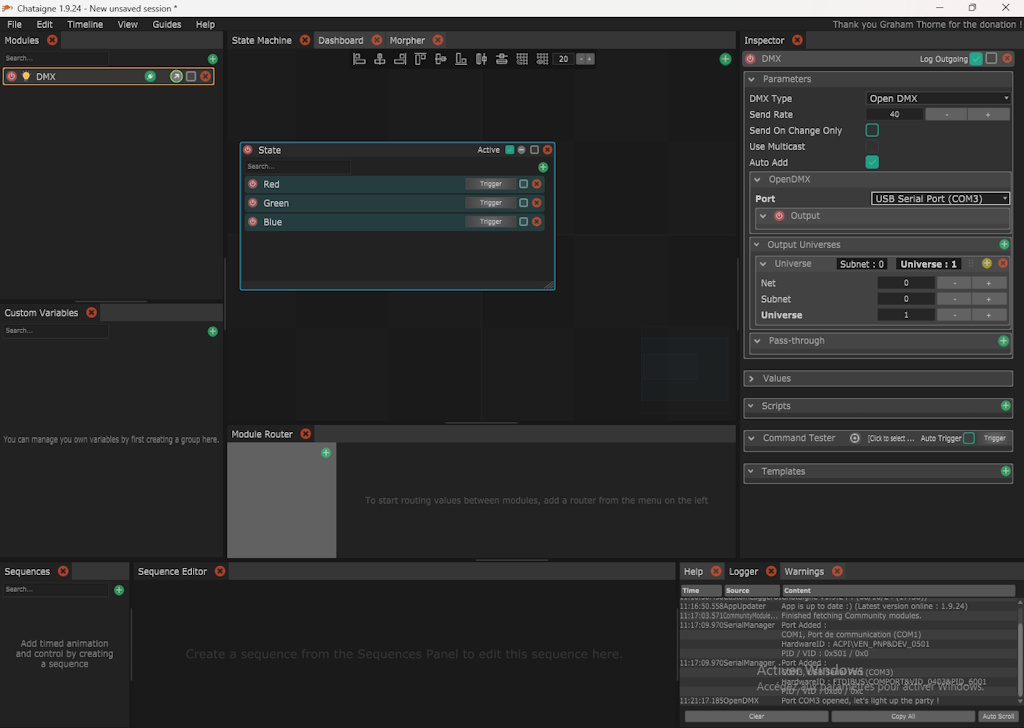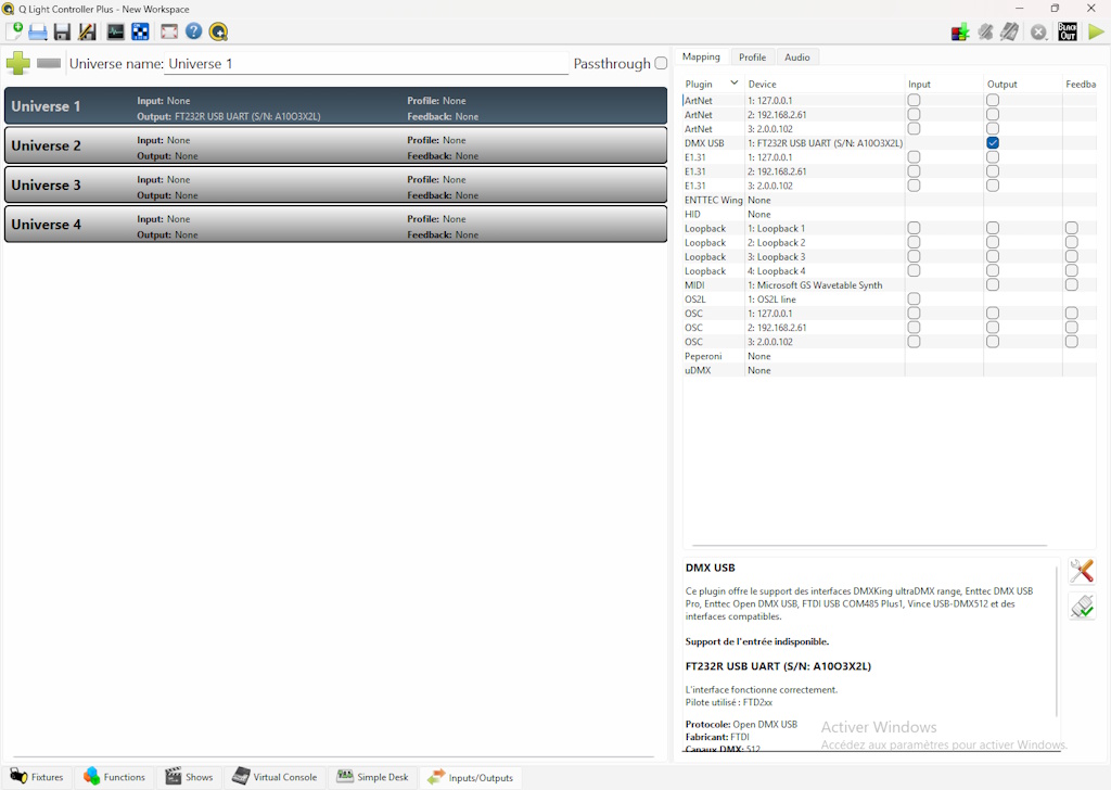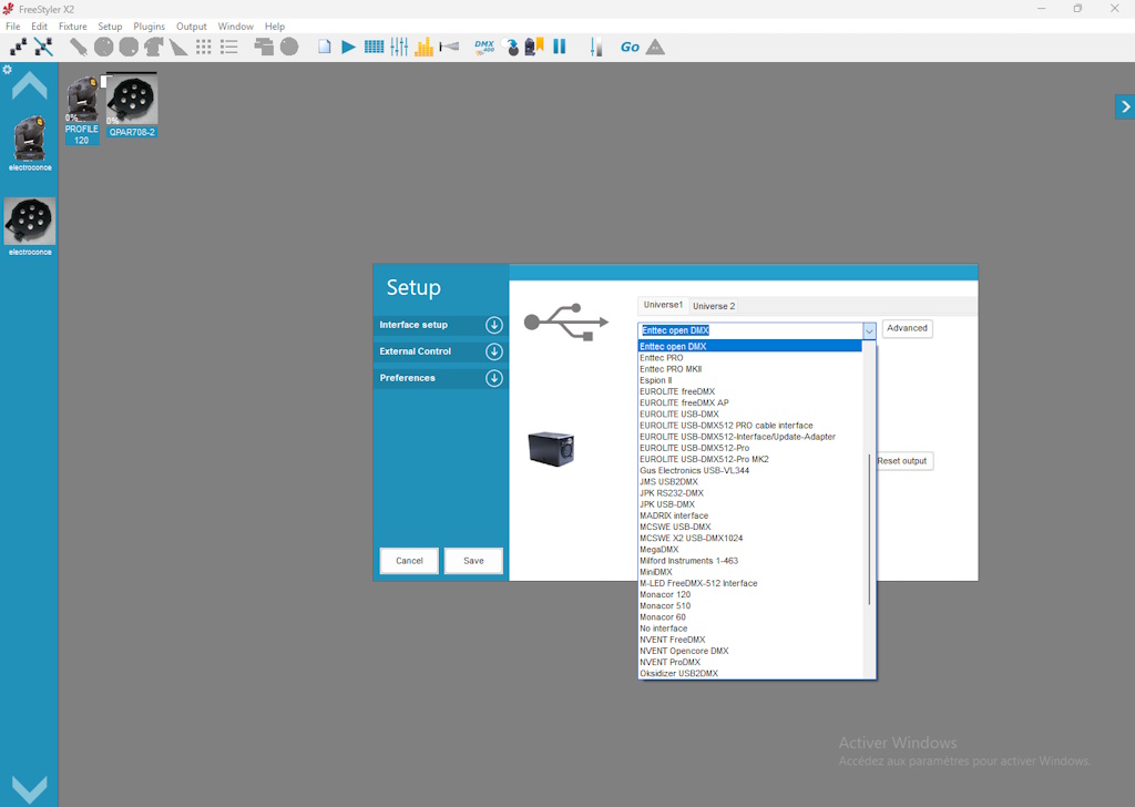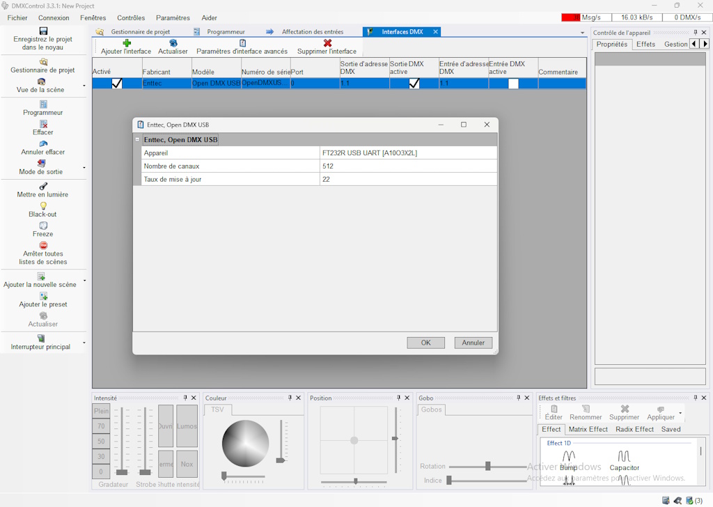 Une fois votre logiciel compatible « Open-DMX » choisi, vous pouvez configurer votre matériel en sortie en sélectionnant dans les paramètres de sortie de votre logiciel l’interface comme « Open-DMX ».