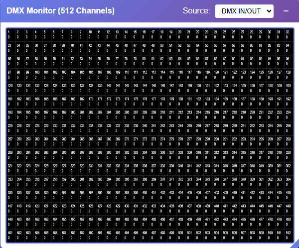 Affiche en temps réel les 512 canaux DMX sous forme de grille colorée