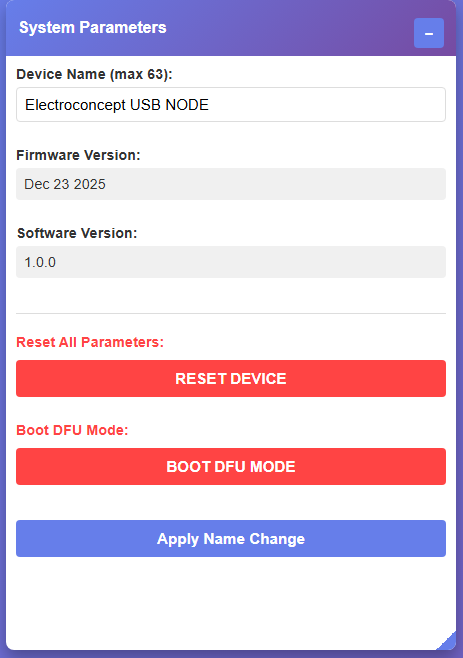 BOOT DFU MODE : Redémarre le boîtier en mode DFU pour mise à jour firmware (⚠️ déconnecte le device)