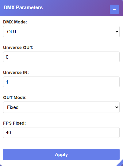 FPS Fixed : Fréquence de rafraîchissement DMX en mode Fixed (16-44 Hz, défaut : 40 Hz)