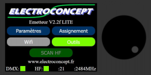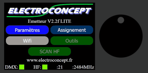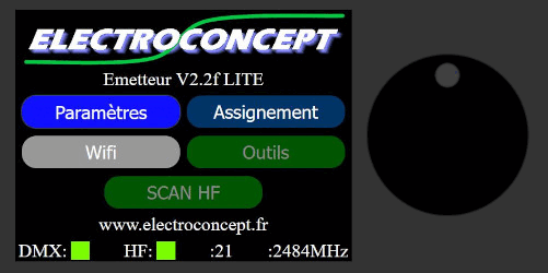From the home screen, four menus are accessible: Settings, Assignment, Tools, and HF Scan. There is no Wi-Fi menu on Lite emitters. For Wi-Fi functionality, we recommend an Art-Net emitter available in our shop.